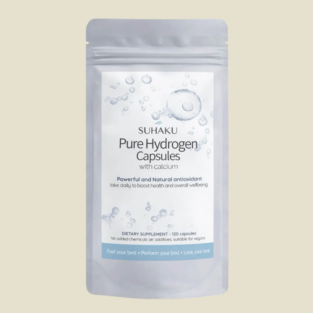 Discover SUHAKU Pure Hydrogen Capsules made in Japan: unlike fizzy effervescent tablets that need to be dissolved in water, SUHAKU capsules can be swallowed easily with a sip of water - pure H2 is generated naturally in your stomach by the fossilised, weathered reef-building coral calcium.